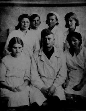ВИНОКУРОВА (ИЛЬИНА) Зинаида Деомидовна (на фото – 2-й ряд, 1-я слева) Старшина-фармацевт эвако-госпиталя №3997. Призвана Кировским военкоматом в 1941 году. С 31 августа 1941 года по 15 ноября 1945 года служила на первом Украинском фронте. |